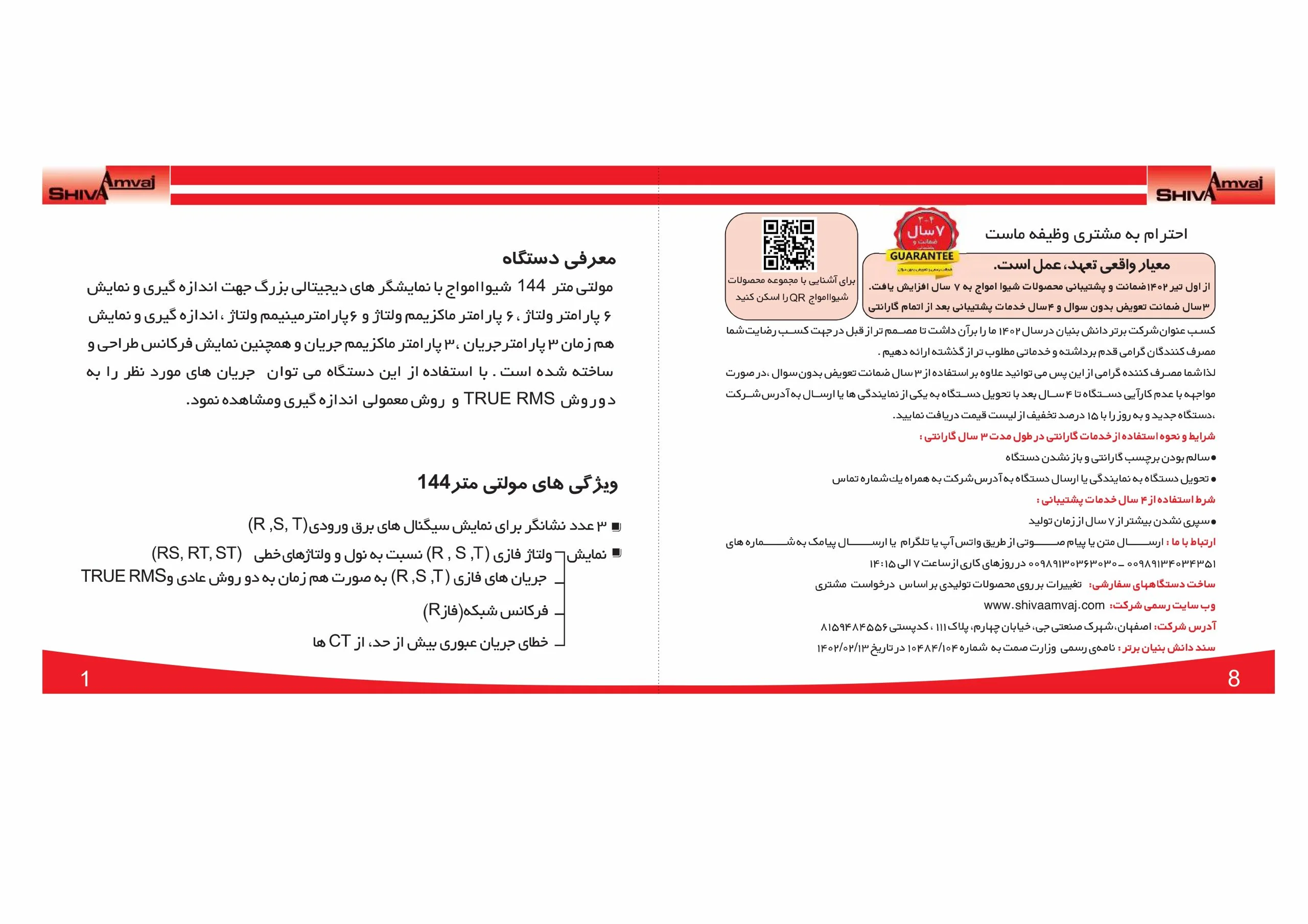 مولتی متر ۱۴۴ شیواامواج با نمایشگر های دیجیتالی بزرگ جهت اندازه گیری و نمایش ۶ پارامتر ولتاژ , ۶ پارامتر ماکزیمم ولتاژ و ۶پارامترمینیمم ولتاژ ، اندازه گیری و نمایش هم زمان ۳ پارامتر جریان, ۳ پارامتر ماکزیمم جریان و همچنین اندازه گیری و نمایش فرکانس طراحی و ساخته شده است.با استفاده از این دستگاه می توان جریان های مورد نظر را به دو روش TRUE RMS و روش معمولی اندازه گیری ومشاهده نمود.